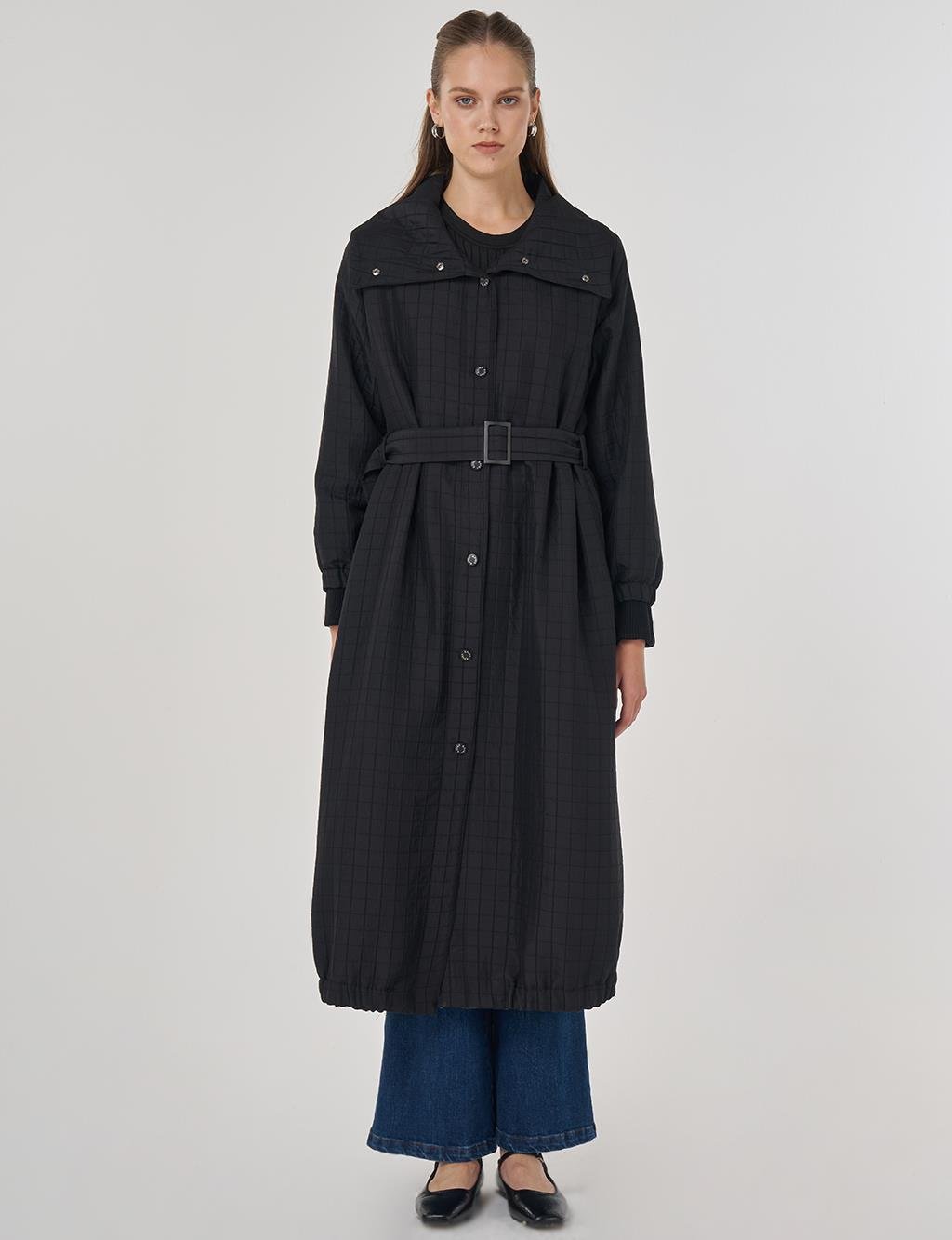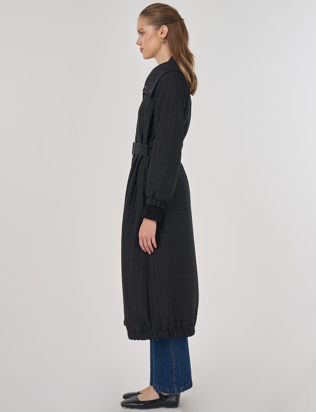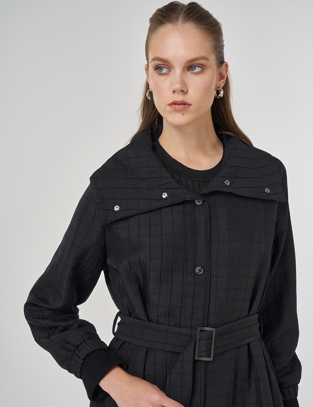 Dik Yaka Kapitoneli Trençkot Siyah