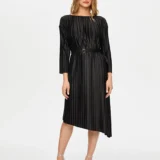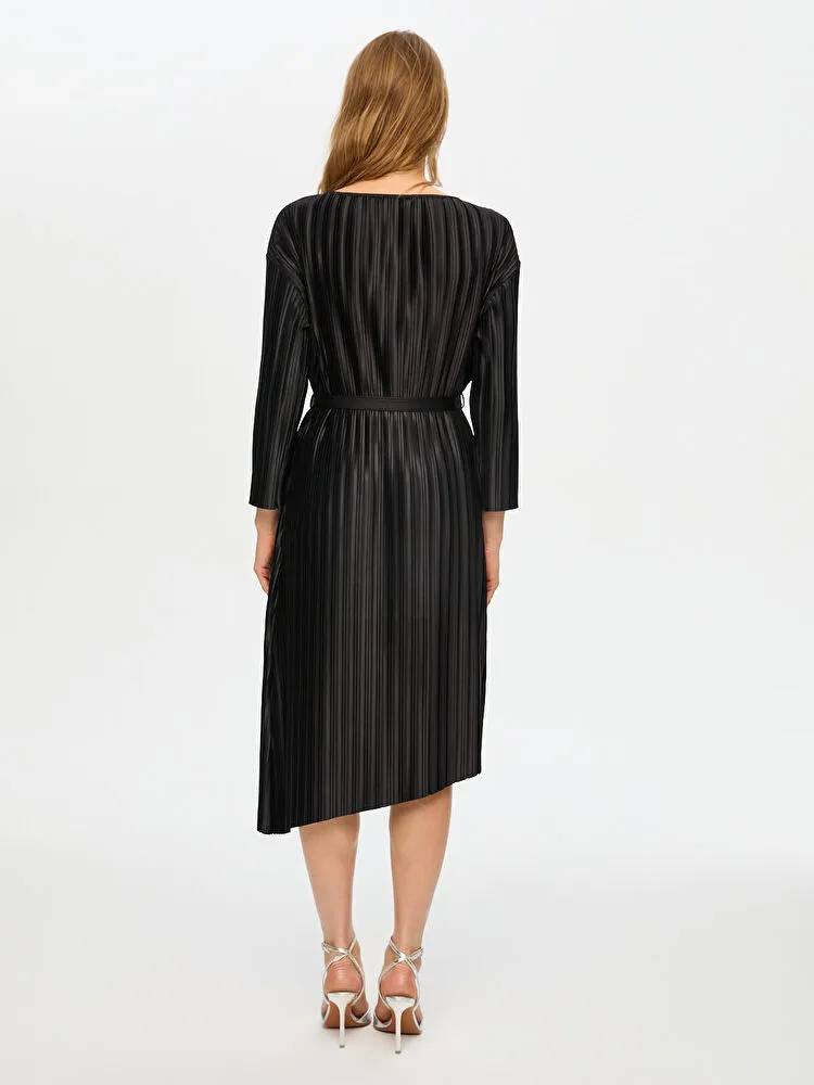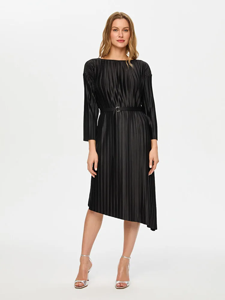 Ürün Adı : Kayık Yaka Kendinden Pililseli Uzun Kol Elbise