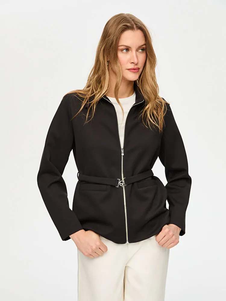 Önü Fermuarlı Kemer Detaylı Örme Ceket
